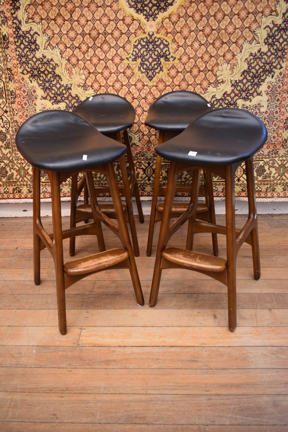 A SET OF FOUR RETRO 1970S WOODEN AND BLACK VINYL STOOLS (A/F) (LEONARD JOEL DELIVERY SIZE: MEDIUM) (76H X 35W X 40D CM)