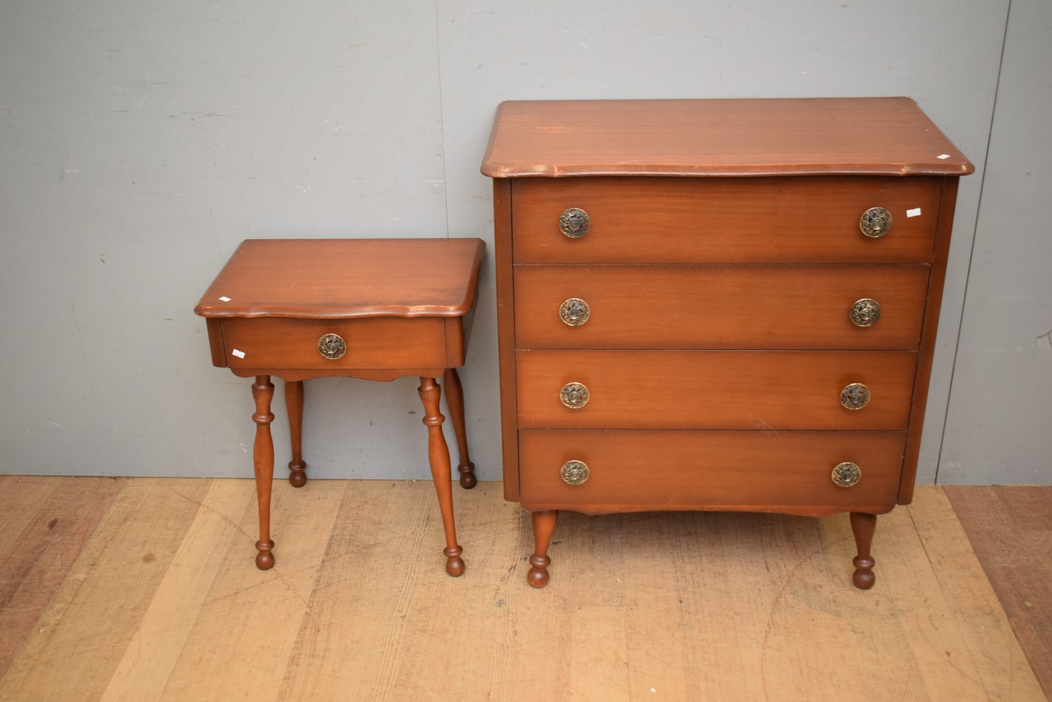 A 1960S AUSTRALIAN MADE MYER HERITAGE WARE FOUR DRAWER CHEST OF DRAWERS WITH MATCHED SINGLE DRAWER BEDSIDE (A/F) (CHEST 91H X 83W X 46D CM) (LEONARD JOEL DELIVERY SIZE: LARGE)