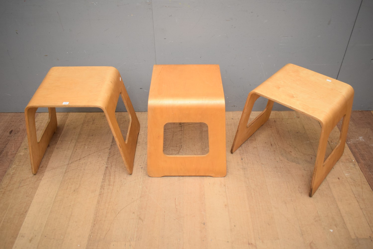 A GROUP OF THREE 1970S RETRO FOLDED PLYWOOD STACKING STOOLS/SIDETABLES (A/F) ( 46H X 49W X 42D CM) (LEONARD JOEL DELIVERY SIZE: MEDIUM)