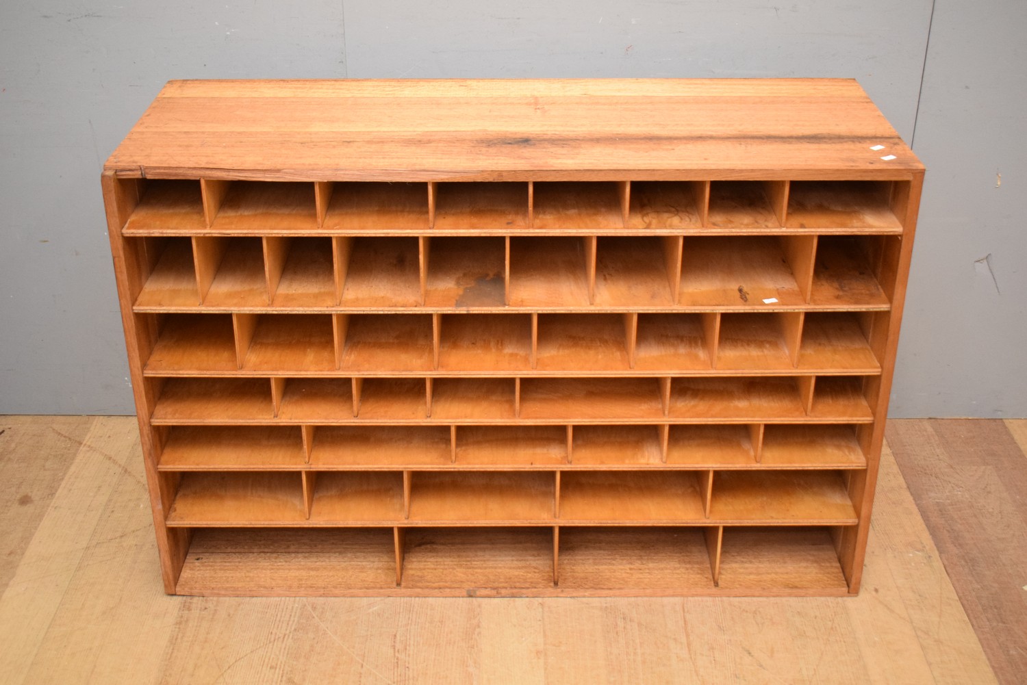 A 1940S AUSTRALIAN HARDWOOD 47 SECTION PIGEON HOLE UNIT (A/F) (81H x 124W x 45D CM) (PLEASE NOTE THIS HEAVY ITEM MUST BE REMOVED BY CARRIERS AT THE CUSTOMER'S EXPENSE. LEONARD JOEL STAFF CANNOT ASSIST CARRYING THIS ITEM) (X-LARGE ITEM)