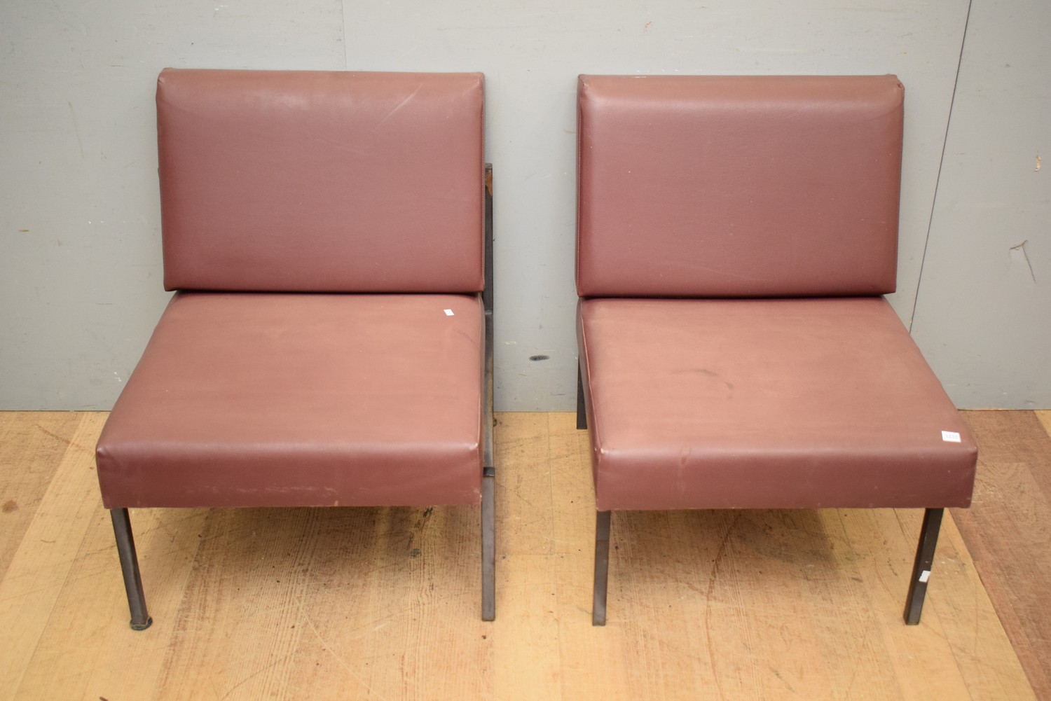 A PAIR OF 1950S AUSTRALIAN MADE RETRO BURGUNDY SLAB CHAIRS ON STEEL BASES, EX ORMOND COLLEGE (76H x 57W x 71D CM) (LEONARD JOEL DELIVERY SIZE: LARGE)