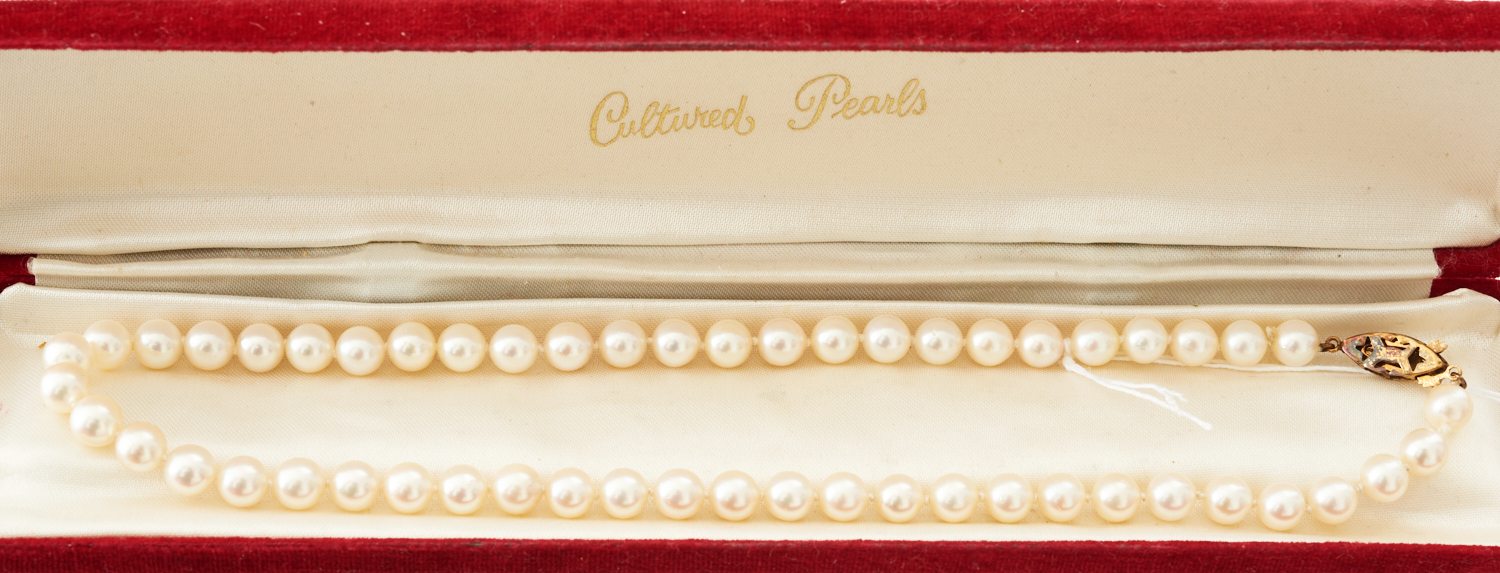A SINGLE STRAND OF CULTURED PEARLS TO A CLASP IN 14CT GOLD, 40CMS