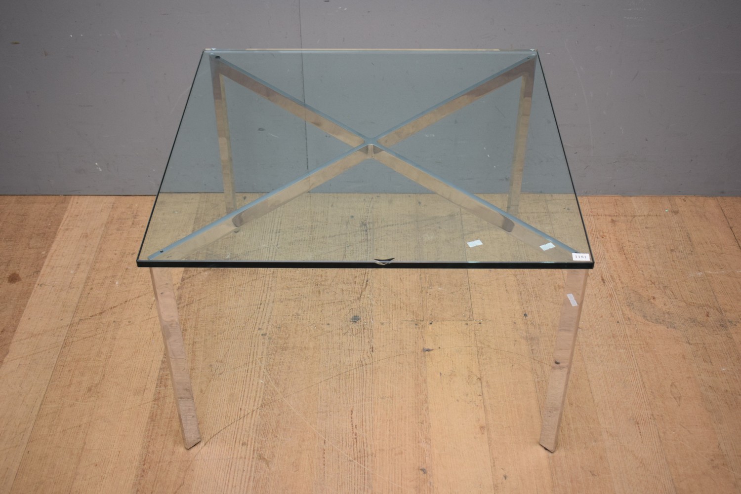 A 1980S CHROME BASED BARCELONA STYLE GLASS TOPPED COFFEE TABLE (A/F SMALL FLAW TO GLASS TOP) ( 46H X 70W X 70D CM) (PLEASE NOTE THIS HEAVY ITEM MUST BE REMOVED BY CARRIERS AT THE CUSTOMER'S EXPENSE. LEONARD JOEL STAFF CANNOT ASSIST CARRYING THIS ITEM) (X-LARGE ITEM)