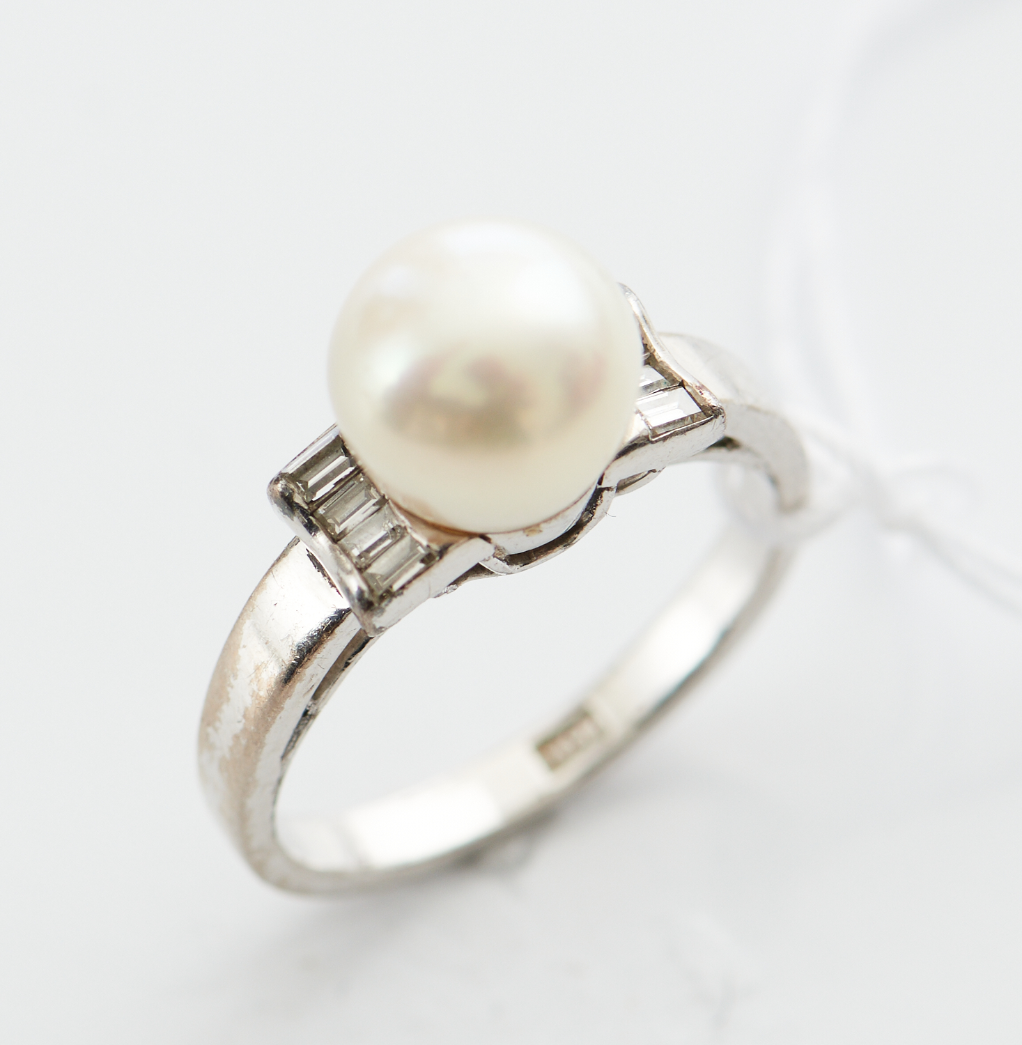 A PEARL AND BAGUETTE CUT DIAMOND RING IN 18CT WHITE GOLD, SIZE L-M, 3.6GMS