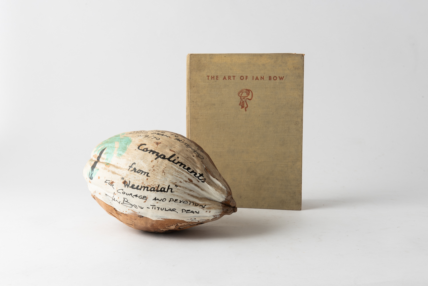 THE ART OF IAN BOW BY CLIVE TURNBULL (1954) AND A PAINTED COCONUT BOTH SIGNED BY IAN BOW (A/F), LEONARD JOEL LOCAL DELIVERY SIZE: SMALL