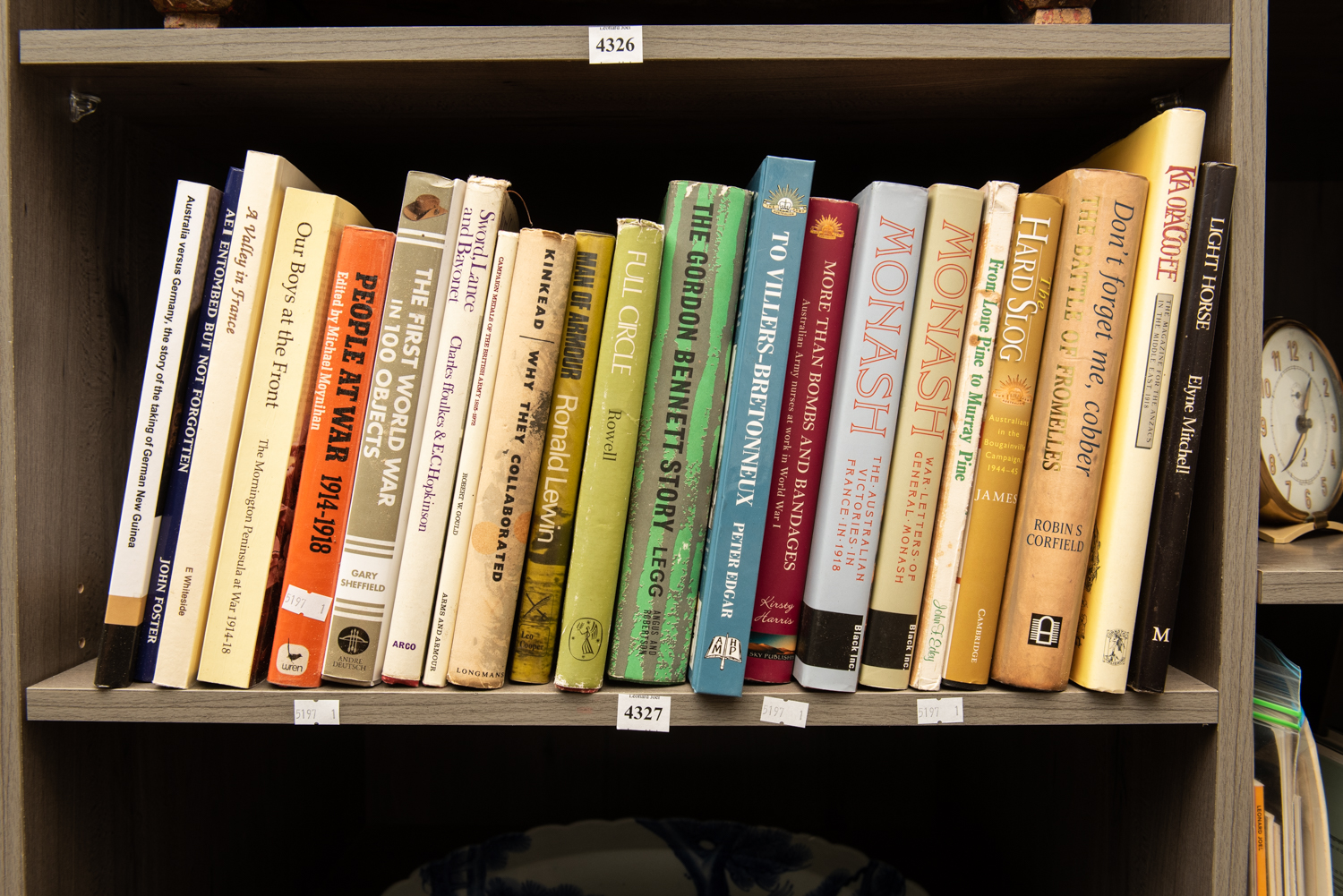 A SHELF OF BOOKS RELATING TO MILITARY HISTORY INCLUDING THE GORDON BENNETT STORY, FRANK LEGG AND TO VILLERS-BRETONNEUX, PETER EDGAR, LEONARD JOEL LOCAL DELIVERY SIZE: SMALL