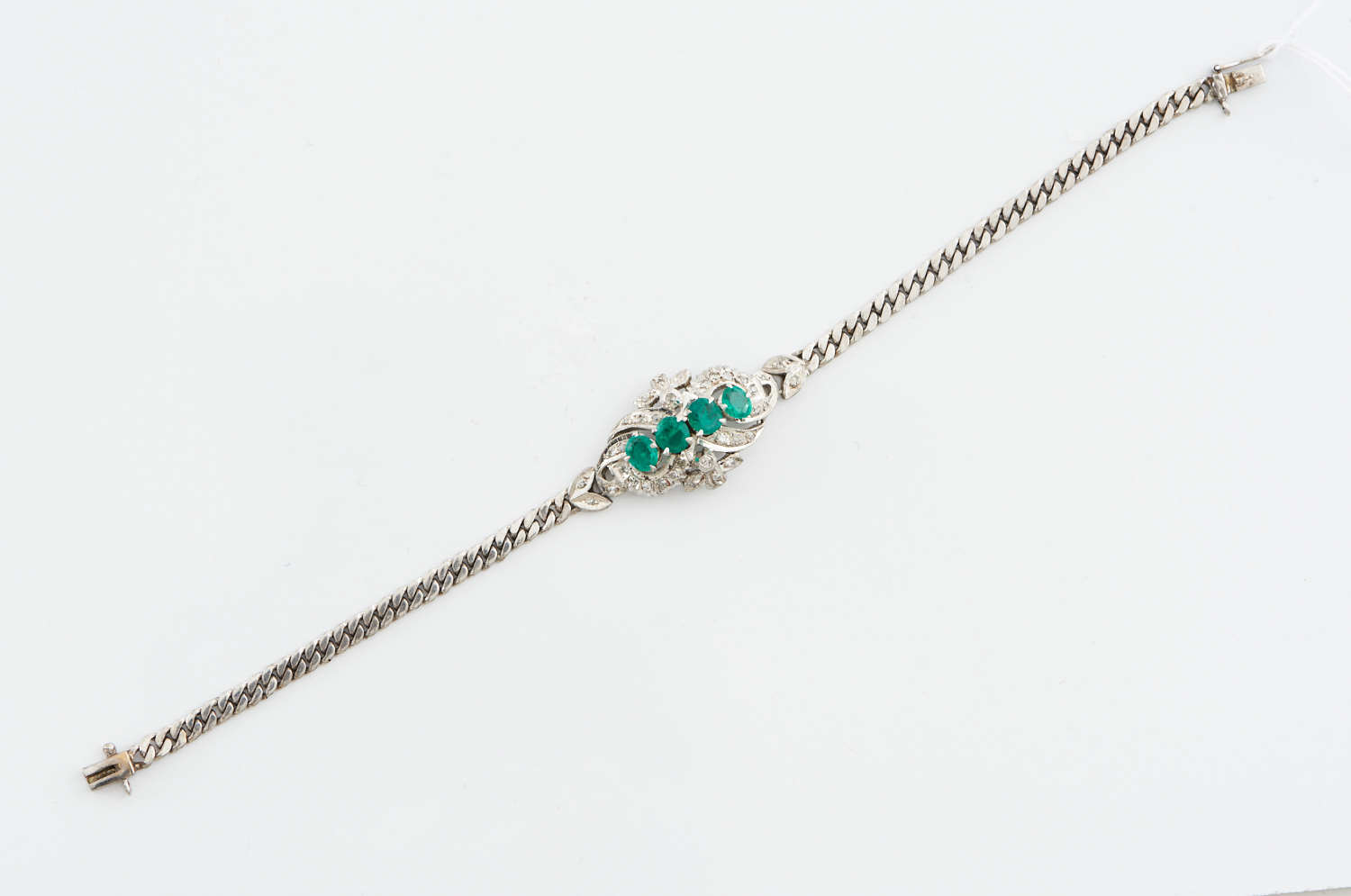 AN EMERALD AND DIAMOND BRACELET IN 9CT WHITE GOLD, 16CMS, 8.1GMS