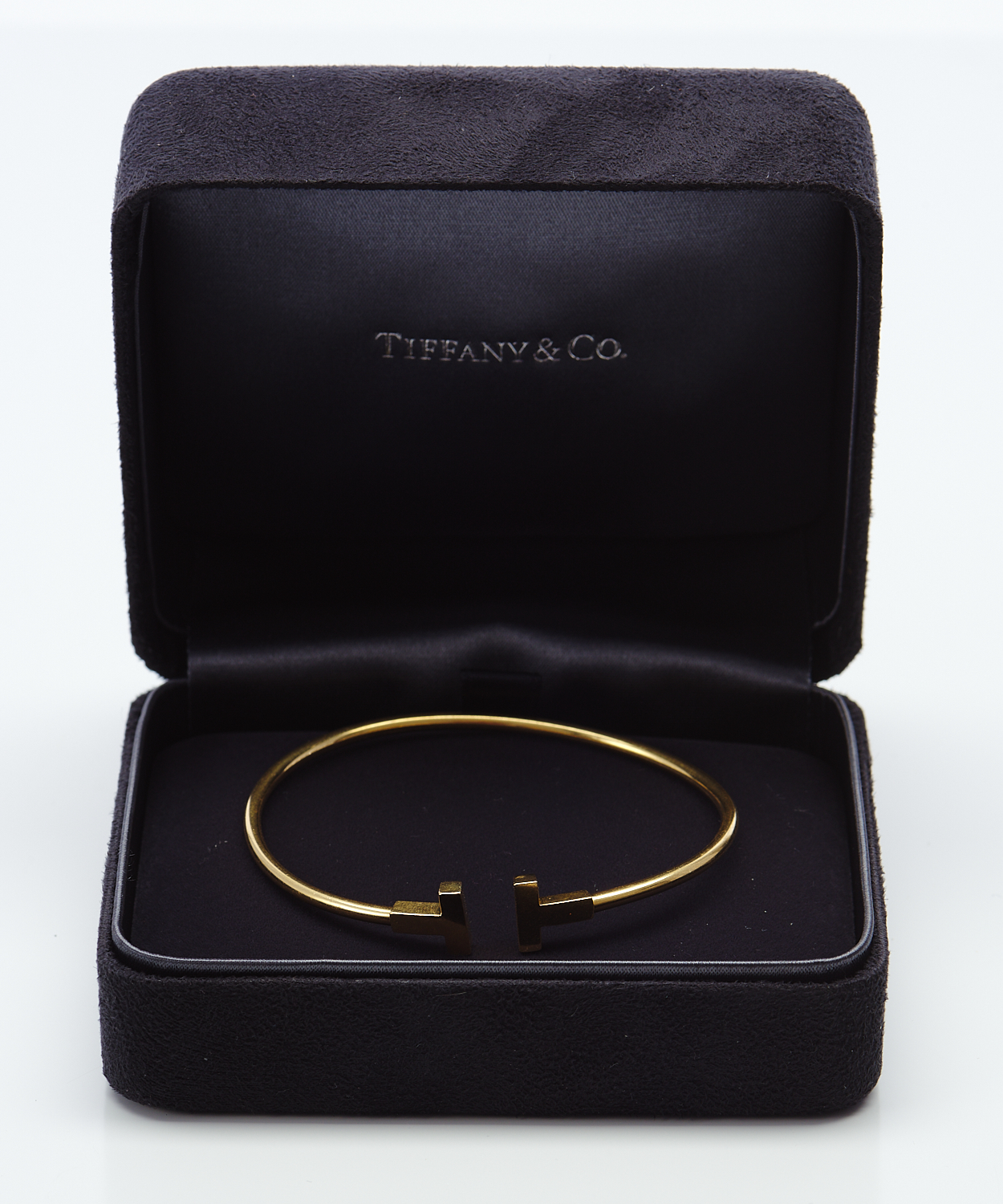From the 'Tiffany T' collection, the open cuff with 'T' shaped terminals, signed, in 18ct gold, boxed.