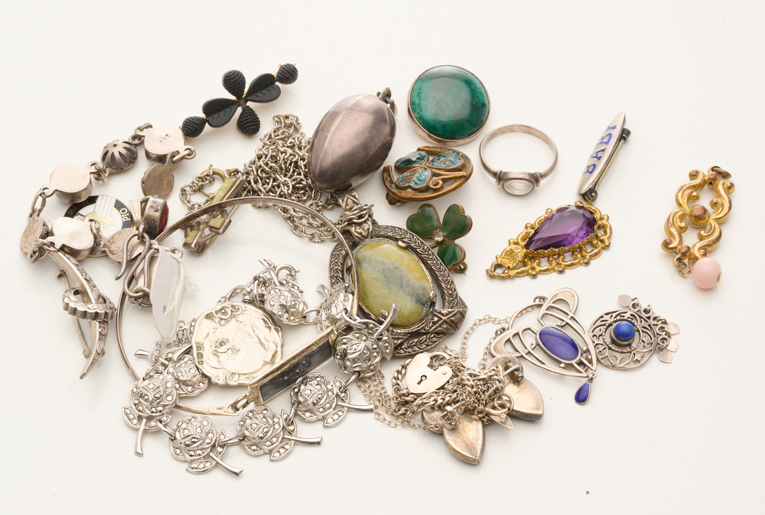 A LARGE COLLECTION OF ANTIQUE AND VINTAGE JEWELLERY INCLUDING A VICTORIAN BROOCH IN STERLING SILVER, AN ART NOUVEAU PENDANT IN STERLING SILVER AND A BOG OAK BROOCH