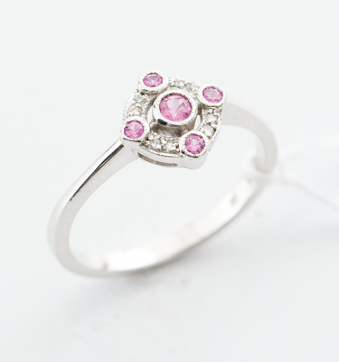 A PINK SAPPHIRE AND DIAMOND RING IN 9CT WHITE GOLD, SIZE N, 1.82GMS