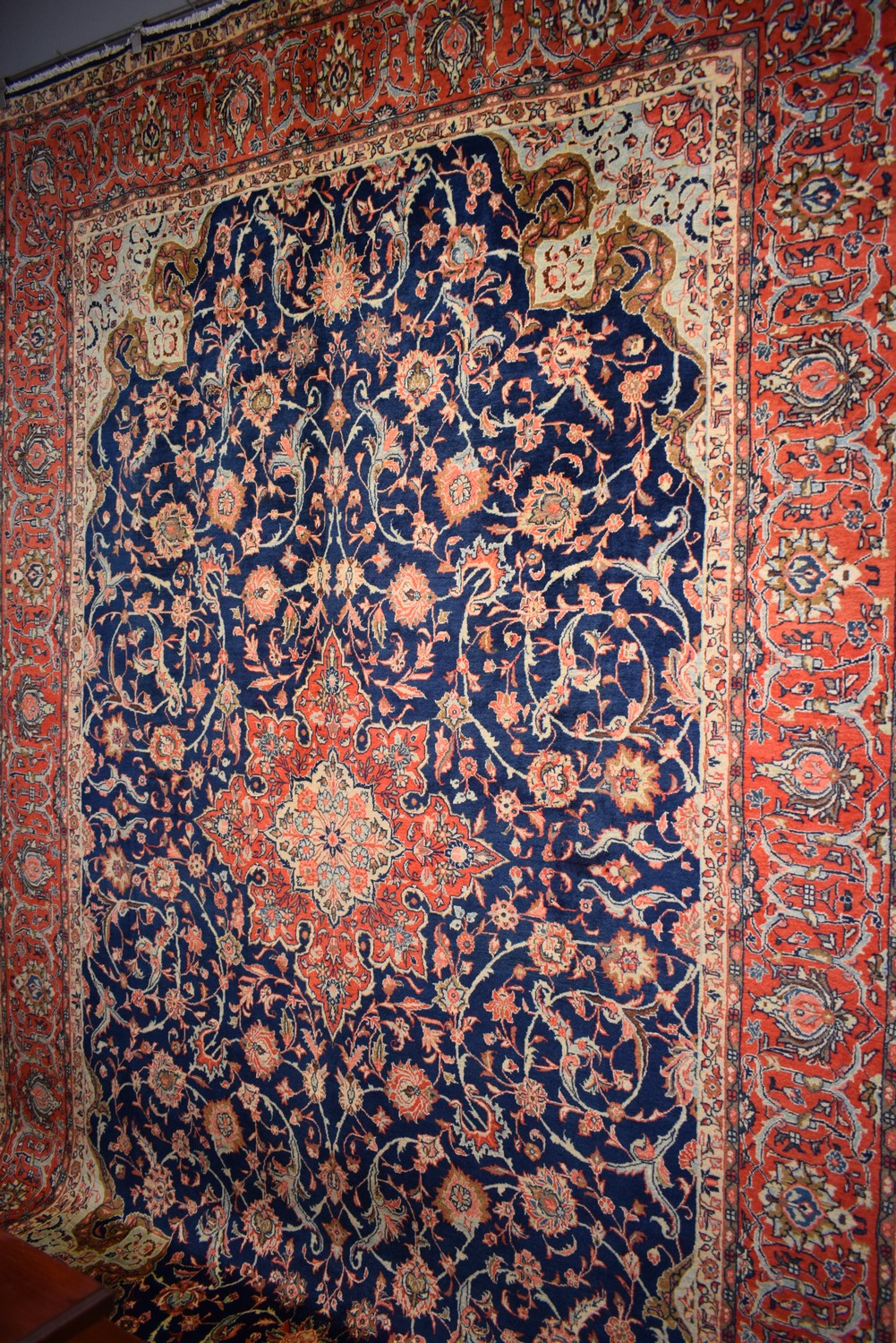 A FINE PERSIAN SAROUQ CARPET. 100% KORK (LAMB) WOOL PILE. FINELY HAND-KNOTTED SAROUQ WEAVE WITH CLASSIC DESIGN OF STYLIZED FLORAL MEDALLION & QUARTERED CORNER MEDALLIONS IN A NAVY BLUE FIELD OF PALMETTES, FLORAL MOTIFS & SAZ LEAVES. MAJOR BORDER OF PALMETTES & SAZ LEAVES. MINOR BORDERS OF FLOWER HEADS & TENDRILS. EX-GALLERY EXHIBITED. IN SUPERB CONDITION. CERTIFICATE OF AUTHENTICITY INCLUDED. SIZE: 400X265CM ORIGIN: PERSIA - RRP: $6,500