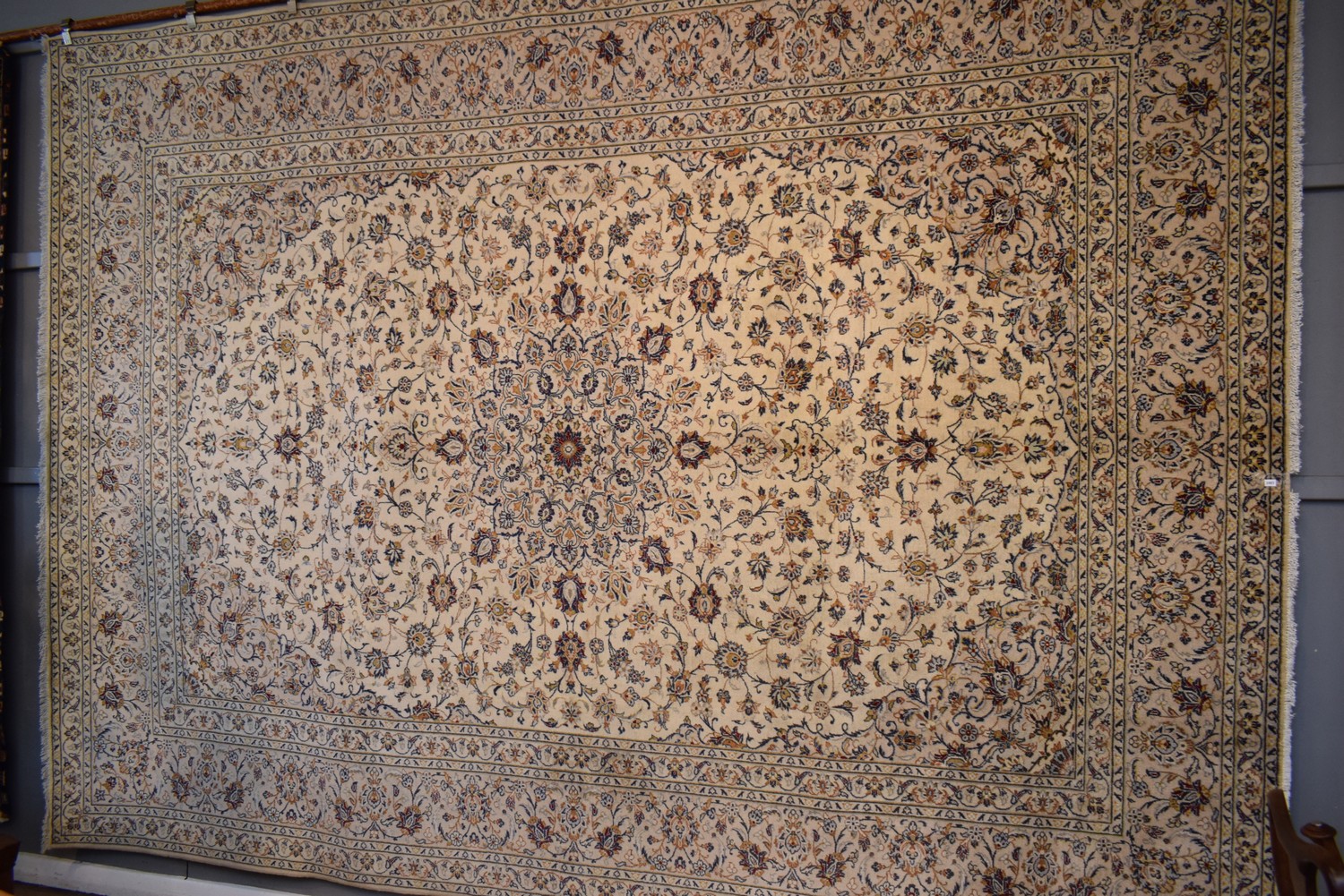 A FINE PERSIAN KASHAN CARPET. 100% WOOL. SOLID & DENSE PILE. FINELY HAND-KNOTTED KASHAN CITY WEAVE FROM THE ISFAHAN PROVINCE. CLASSIC KASHAN BOOK COVER DESIGN OF SUNBURST MEDALLION OF PALMETTES AND QUARTERED CORNER MEDALLIONS IN A CREAM FIELD OF 16TH CENTURY SHAH ABBASSI PALMETTES, FLORAL SPRAYS & TENDRILS. BORDER OF PALMETTES, FLOWER HEADS & TENDRILS. GALLERY INVENTORY. IN EXCELLENT CONDITION. CERTIFICATE OF AUTHENTICITY INCLUDED. SIZE: 400X296CM ORIGIN: PERSIA - RRP: $6,200 (LEONARD JOEL DELIVERY SIZE: X-LARGE)