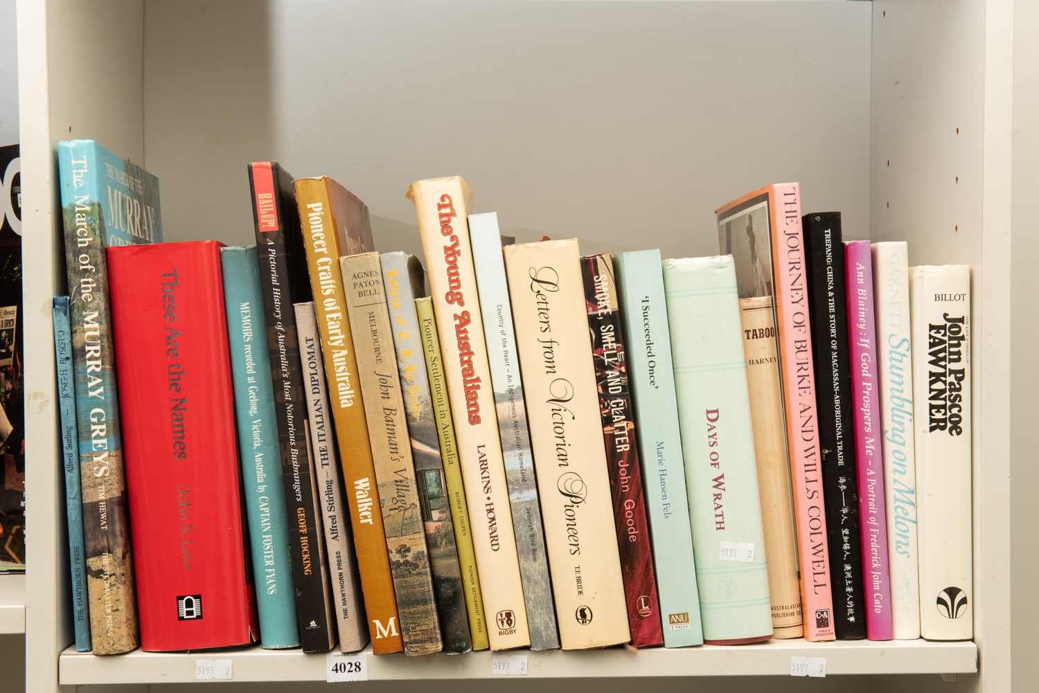 A SHELF OF BOOKS RELATING TO AUSTRALIAN HISTORY INCLUDING THESE ARE THE NAMES, JOHN S LEVI AND CAPTAIN FOSTER FYANS, LEONARD JOEL LOCAL DELIVERY SIZE: SMALL