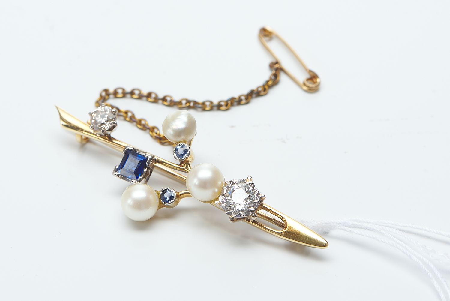 A DIAMOND, SAPPHIRE AND PEARL BROOCH IN 14CT GOLD, 50MM, 6.2GMS