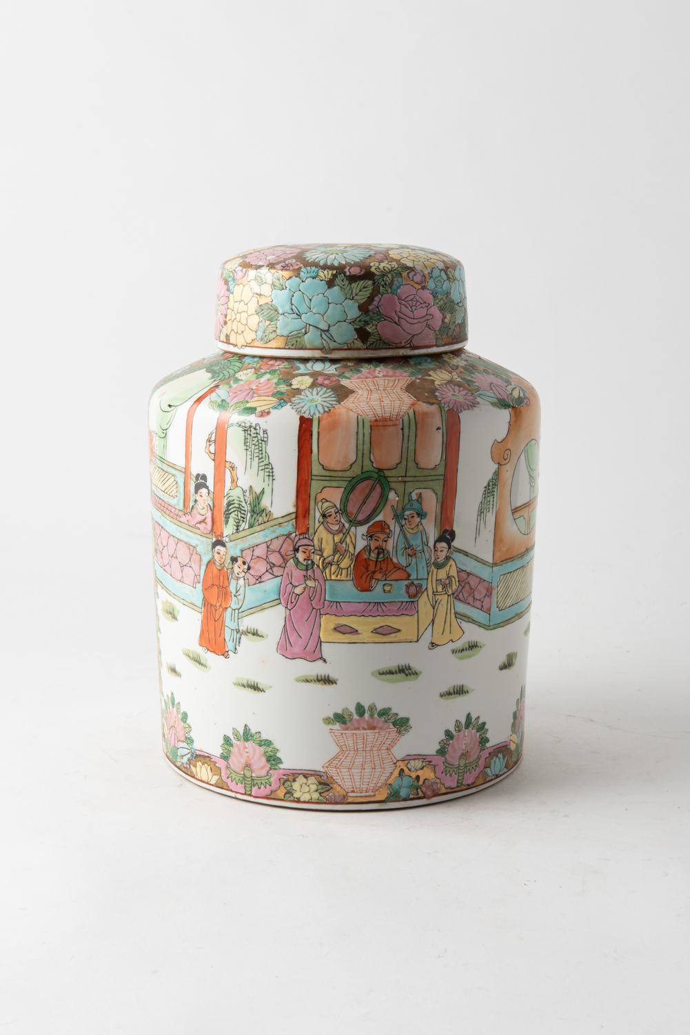 A LARGE CYLINDRICAL CHINESE LIDDED JAR, 30 CM HIGH, LEONARD JOEL LOCAL DELIVERY SIZE: SMALL