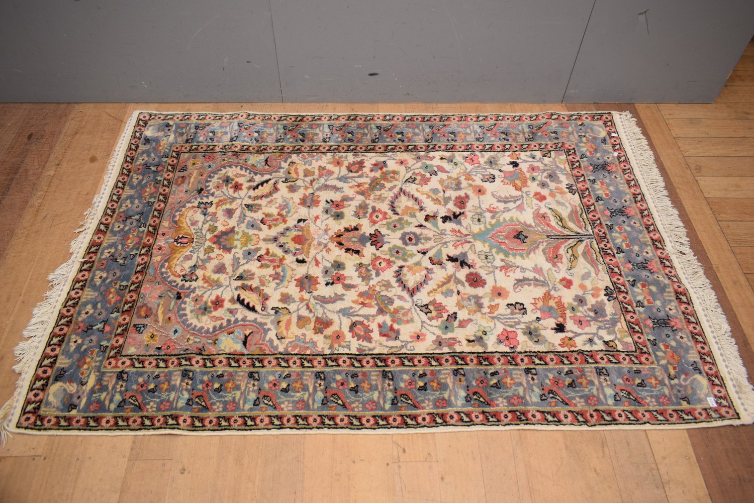 A FINELY WOVEN SILK AND WOOLEN RUG IN PINK, BLUE AND CREAM TONES (190L x 125W CM) (LEONARD JOEL DELIVERY SIZE: MEDIUM)