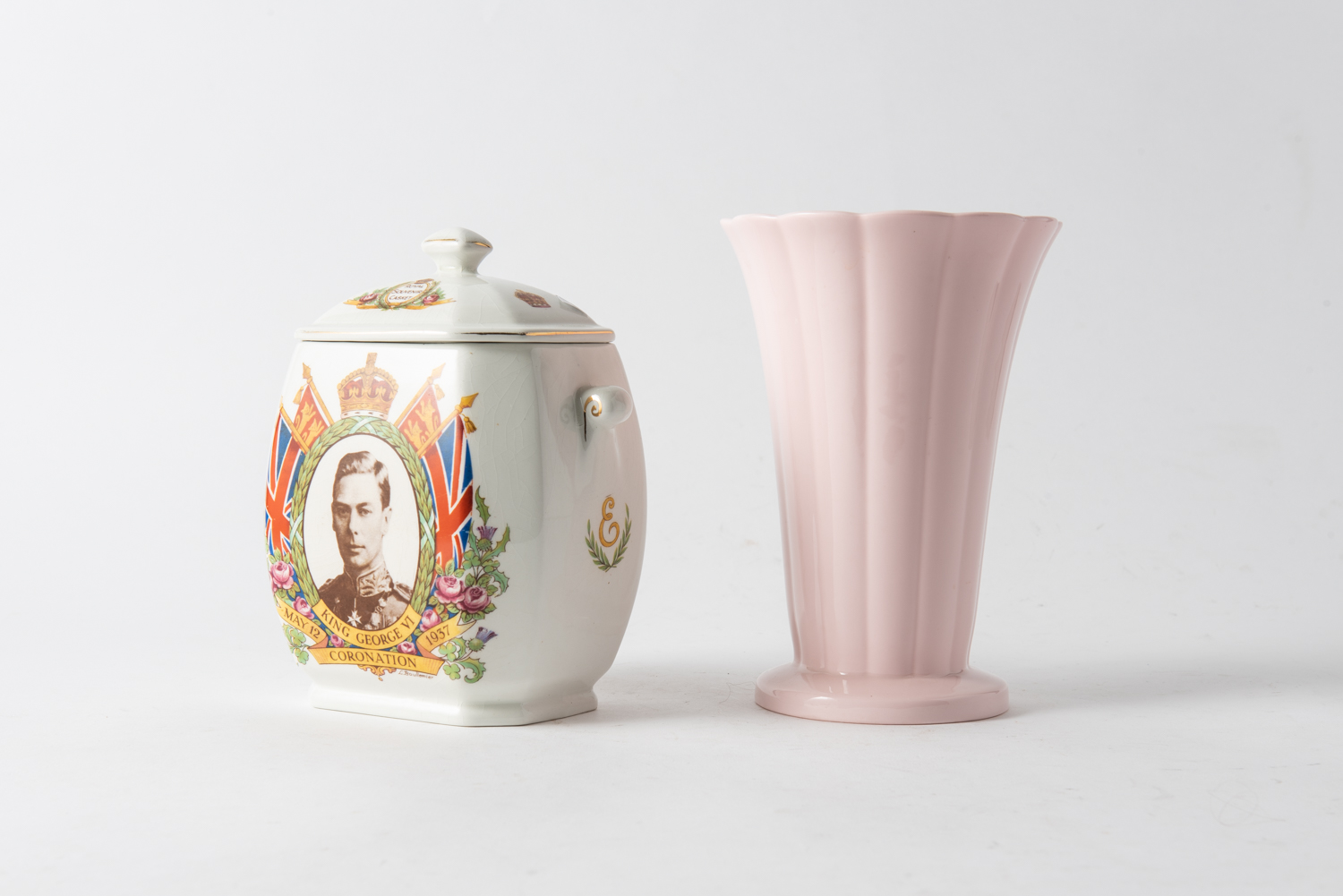 A MALING WARE GEORGE VI CORONATION RINGTONS TEA CANISTER AND A WEDGWOOD VASE IN ALPHINE PINK, VASE H.19CM, LEONARD JOEL LOCAL DELIVERY SIZE: SMALL