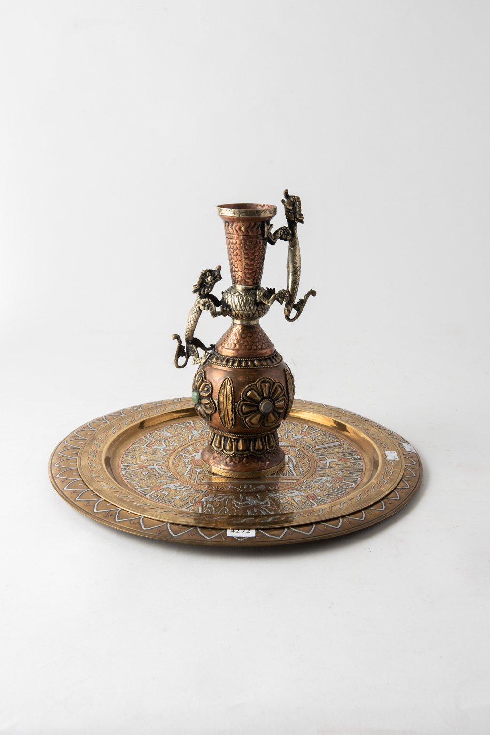 TWO MIDDLE EASTERN SILVER INLAY TRAYS AND A JUG, LEONARD JOEL LOCAL DELIVERY SIZE: SMALL