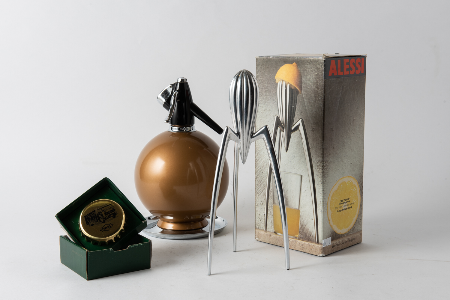 AN ALESSI BOXED JUICER BY PHILLIPPE STARCK, AN ANODISED SODA SYPHON AND TRAY AND GEORG JENSEN/LINFOX BOTTLE OPENER, LEONARD JOEL LOCAL DELIVERY SIZE: SMALL