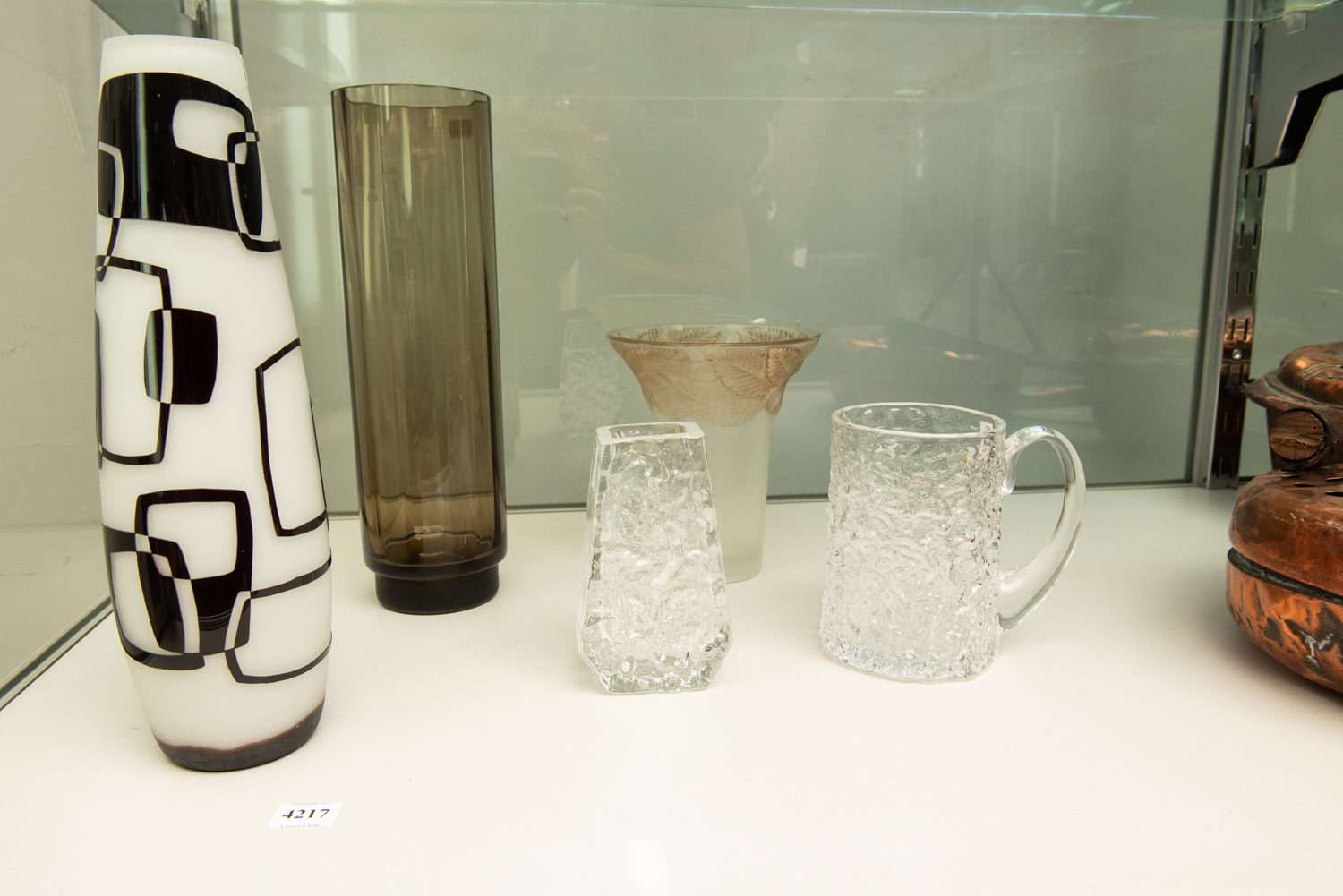 FIVE PIECES OF ART GLASS INCLUDING WHITEFRIARS COFFIN VASE, O'LAY VASE, MOULDED CHERRY VASE AND ICE MUG, THE TALLEST 31 CM HIGH, LEONARD JOEL LOCAL DELIVERY SIZE: SMALL