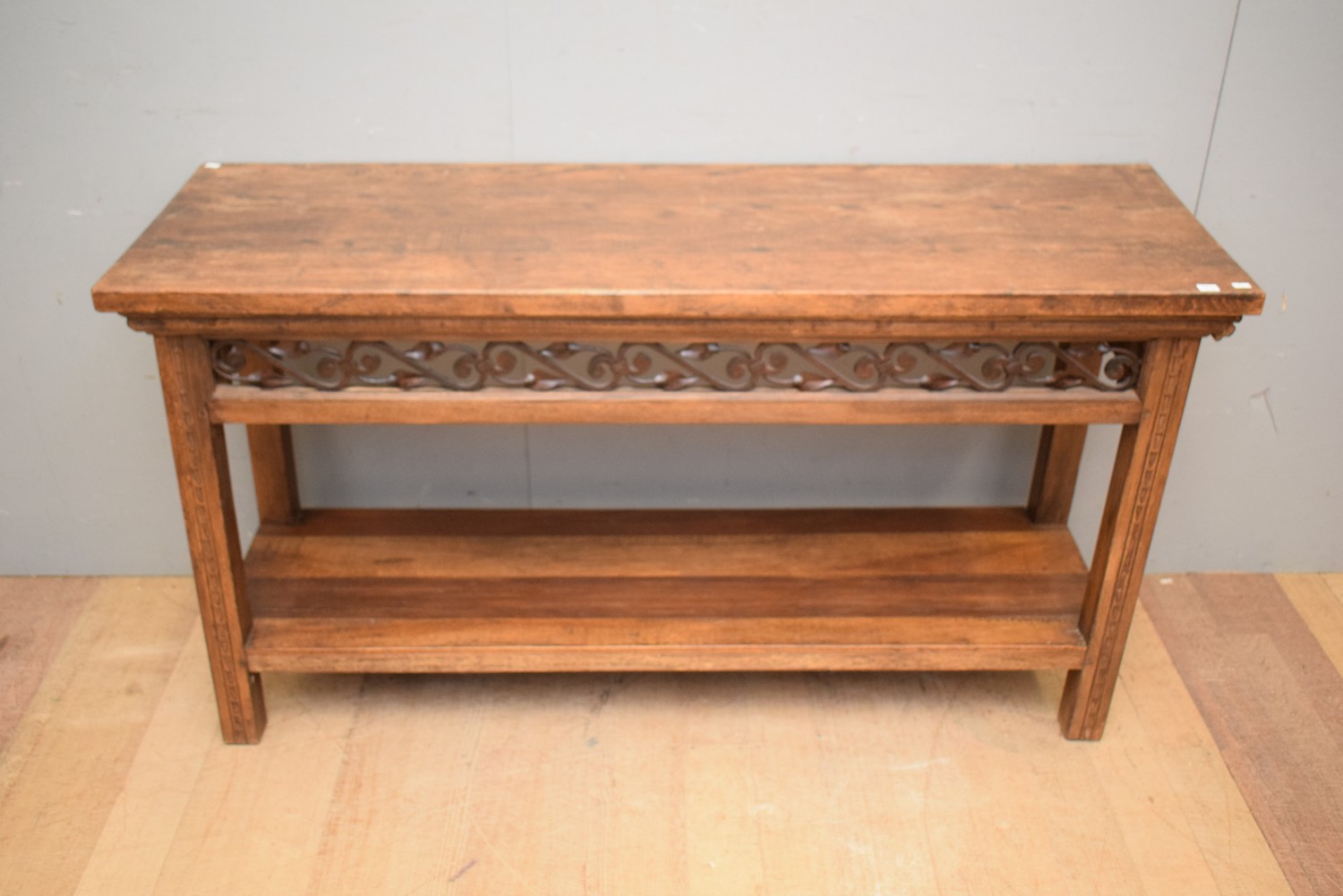 AN OAK AND WROUGHT IRON HALL CONSOLE (81H x 50W x 50D CM) (PLEASE NOTE THIS HEAVY ITEM MUST BE REMOVED BY CARRIERS AT THE CUSTOMER'S EXPENSE. LEONARD JOEL STAFF CANNOT ASSIST CARRYING THIS ITEM) (X-LARGE ITEM)