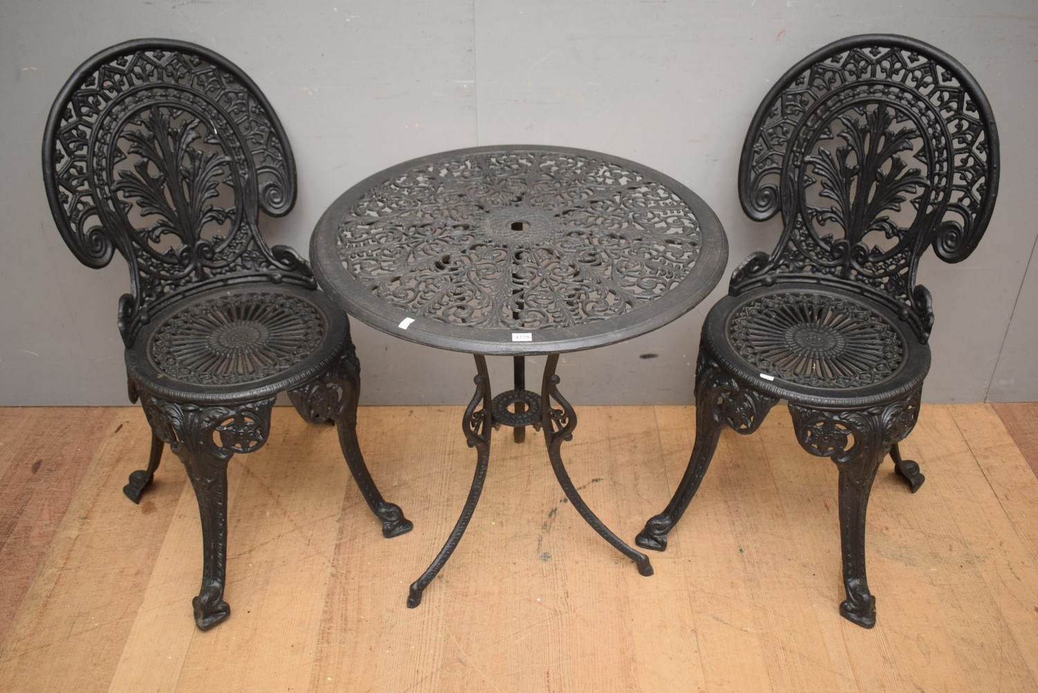 A THREE PIECE CAST IRON OUTDOOR SETTING (TABLE 64H x 6D CM) (LEONARD JOEL DELIVERY SIZE: LARGE)