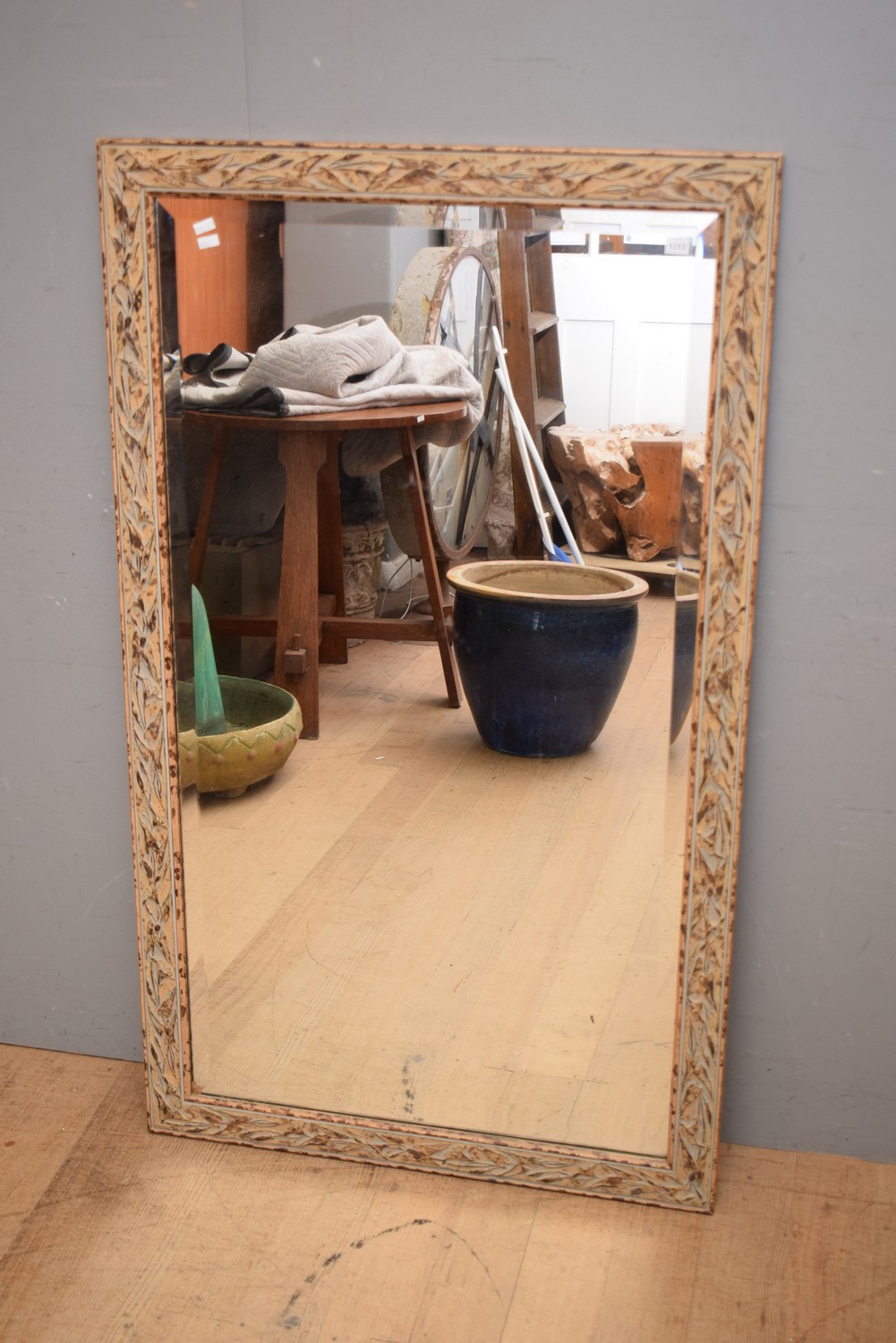 A LARGE WOODEN FRAMED MIRROR WITH BEVELLED EDGES AND CARVED FOLIAGE DESIGN (132H x 78W CM) (LEONARD JOEL DELIVERY SIZE: LARGE)