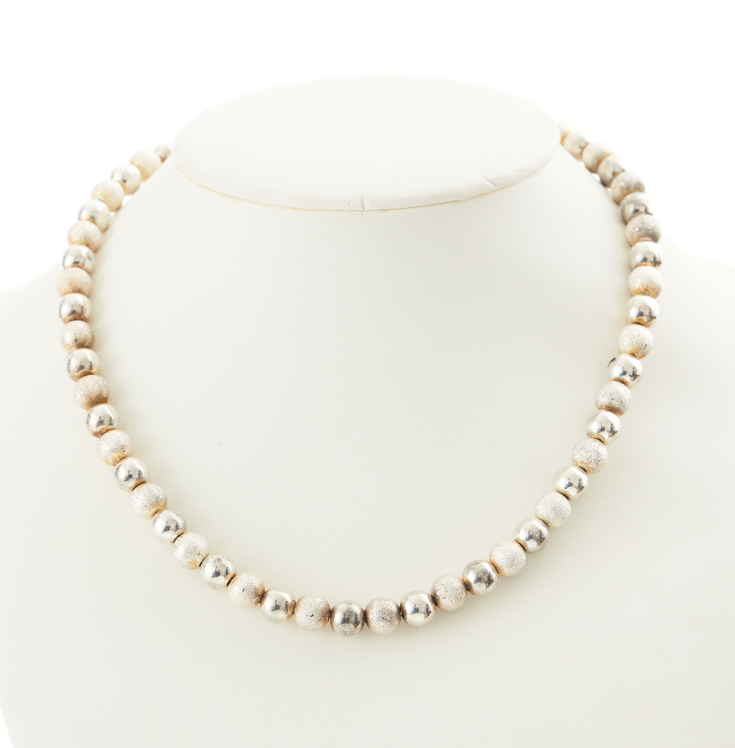 A BEADED NECKLACE IN STERLING SILVER, TOTAL LENGTH 43CMS, 72.5GMS