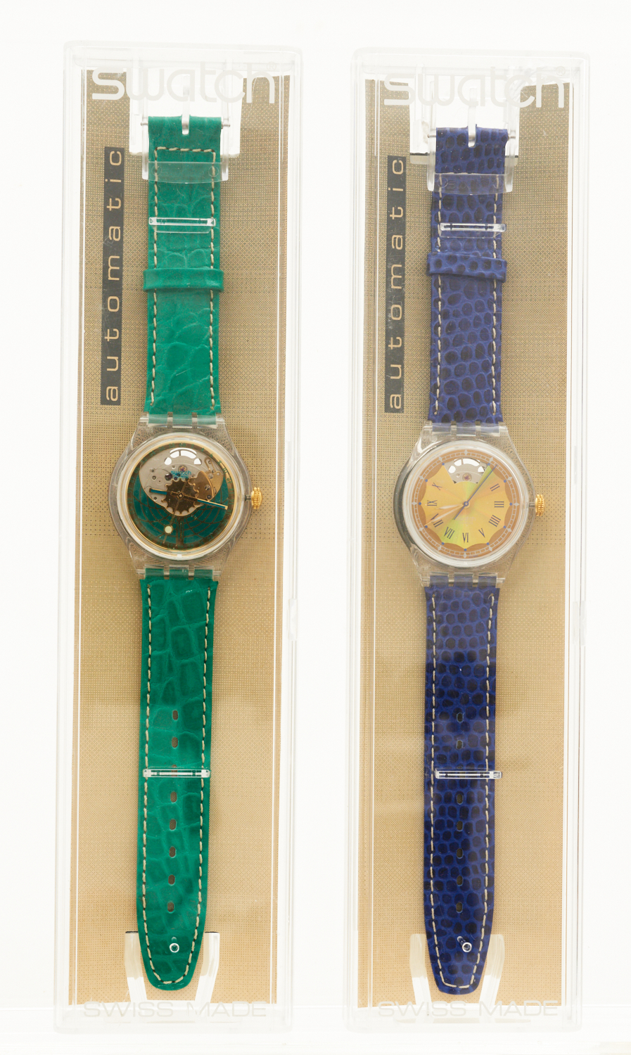 TWO SWATCH AUTOMATIC WRISTWATCHES COMPRISING, EISMEER REF. SAK 112, 1994, TO BLUE LEATHER BANDS, BOXED AND RAMARRO, REF. SAK 111, 1994, TO GREEN LEATHER BANDS, BOXED