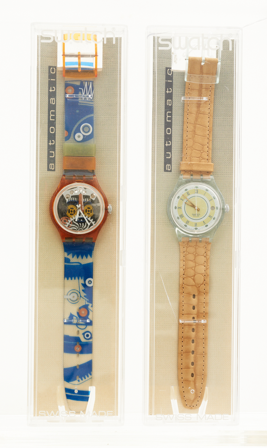 TWO SWATCH AUTOMATIC WRISTWATCHES, COMPRISING AVENIDA REF. SAG 400, 1994, TO CAMEL LEATHER BANDS, BOXED AND ARCIMBOLDO, REF. SAO 100, 1994, TO PRINTED PLASTIC BANDS, BOXED