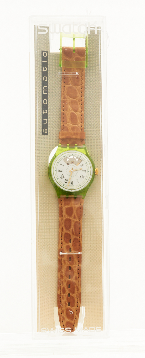 A SWATCH AUTOMATIC WRISTWATCH GRAN VIA, REF. SAG 100, TO CAMEL LEATHER BANDS, 1992, BOXED