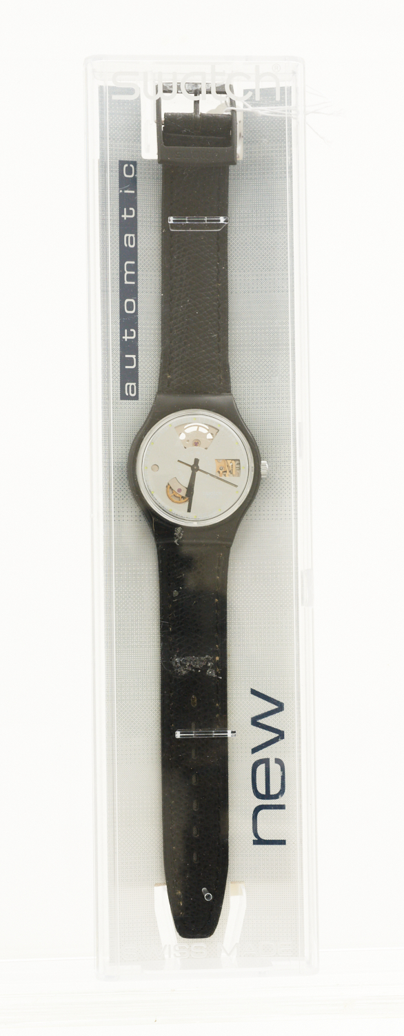 A SWATCH AUTOMATIC WRISTWATCH BLACK MOTION, REF. SAB 100, TO BLACK LEATHER BANDS, 1991-92, BOXED