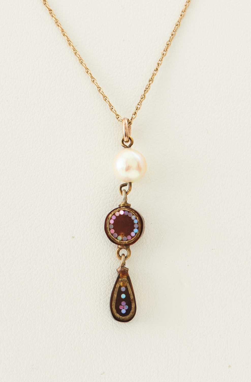 A PIQUE AND CULTURED PEARL PENDANT TO A FINE TRACE CHAIN IN 9CT GOLD