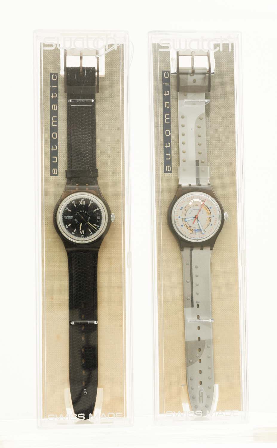 TWO SWATCH AUTOMATIC WRISTWATCHES COMPRISING, SILVER BARON REF. SAM 104, 1994-95, TO SILVER PLASTIC BANDS, BOXED AND ROPPONGI, REF. SAM 400, 1993, TO BLACK LEATHER BANDS, BOXED