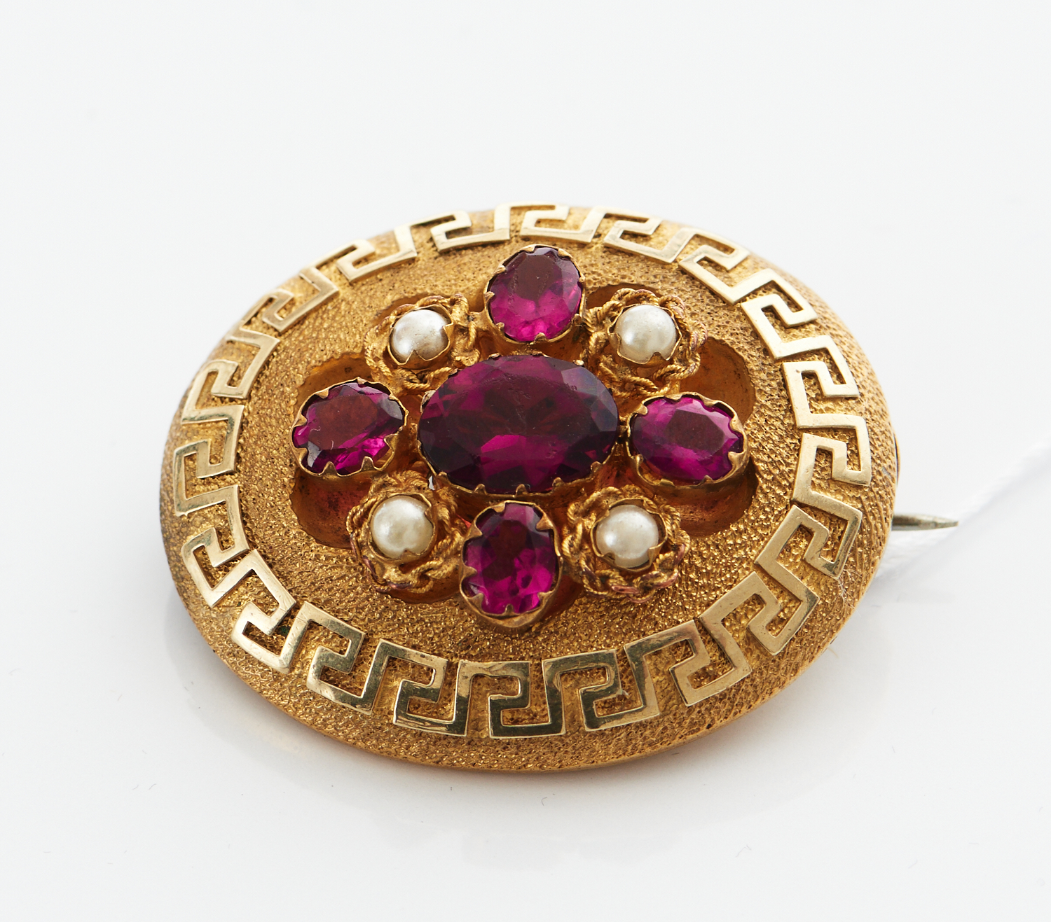 A VICTORIAN GARNET, PEARL AND PASTE SET BROOCH IN PINCHBECK, LENGTH 40MM