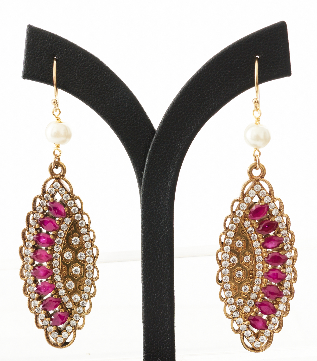 A PAIR OF CULTURED PEARL AND PASTE EARRINGS IN SILVER GILT