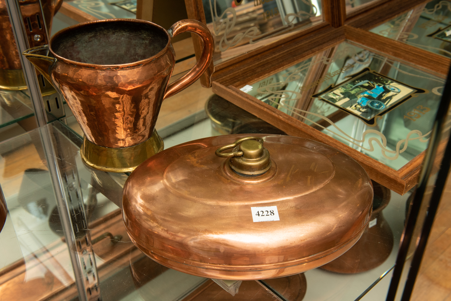 A FRENCH HAMMERED COPPER JUG TOGETHER WITH COPPER LIDDED TUREEN, THE TUREEN 26 CM WIDE, LEONARD JOEL LOCAL DELIVERY SIZE: SMALL