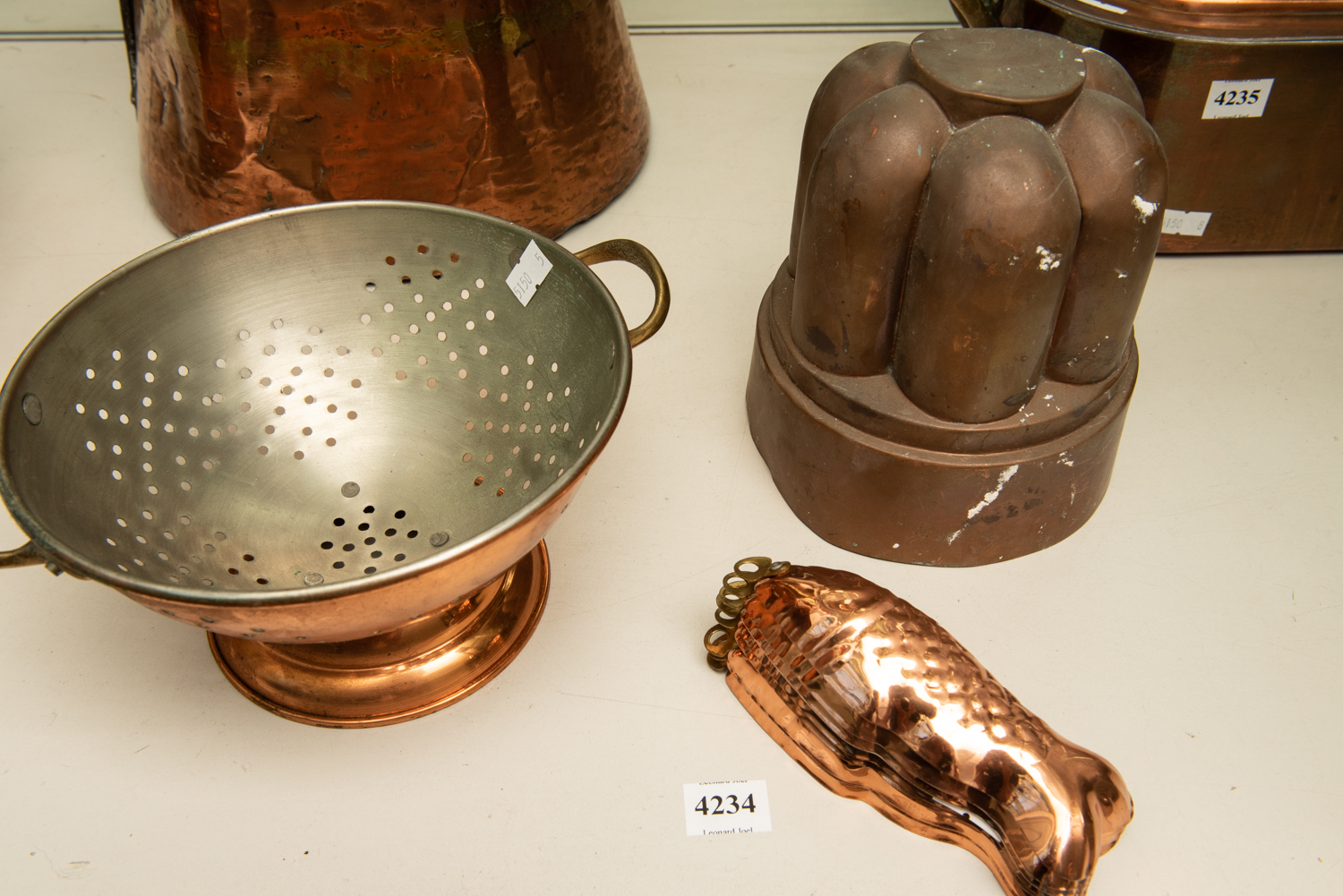 A GROUP OF COPPER KITCHEN ITEMS, INCLUDING COLANDER AND MOULDS, LEONARD JOEL LOCAL DELIVERY SIZE: SMALL