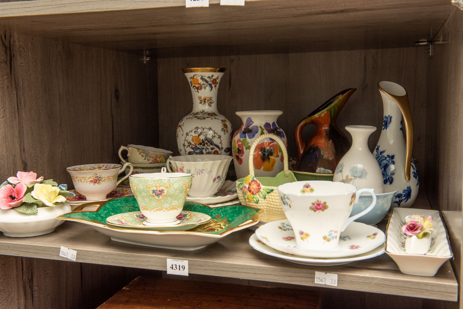 A SHELF OF CHINA INCLUDING TEA WARE, A MALING WARE PLATE (REPAIRED), ROYAL ALBERT, ROYAL DOULTON AND SHELLEY (SOME PIECES A/F), LEONARD JOEL LOCAL DELIVERY SIZE: SMALL
