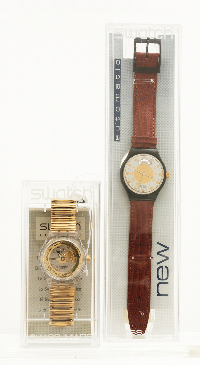 TWO SWATCH AUTOMATIC WRISTWATCHES COMPRISING, 5th AVENUE REF. SAB 101, 1992, TO BROWN LEATHER BANDS, BOXED AND GOLDEN SIXTIES, REF. SAK 115, 1995, TO FLEXIBLE BANDS, BOXED