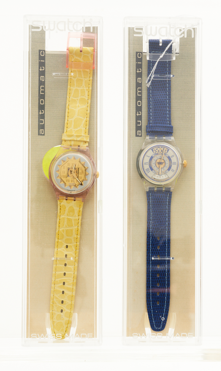 TWO SWATCH AUTOMATIC WRISTWATCHES COMPRISING, ROUND REF. SAK401, 1994, TO BLUE LEATHER BANDS, BOXED AND GIRASOLE, REF. SAP100, 1994, TO YELLOW LEATHER BANDS, BOXED