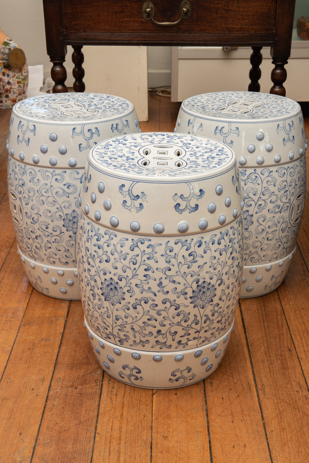 THREE MODERN CHINESE BLUE AND WHITE GLAZED CERAMIC BARRELL STOOLS, (ONE A/F), H.50CM, LEONARD JOEL LOCAL DELIVERY SIZE: MEDIUM