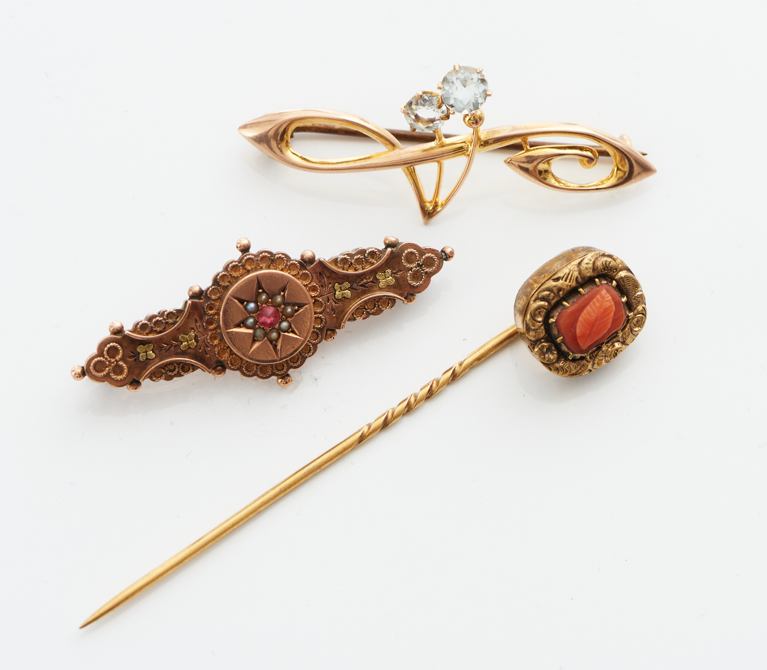A CORAL STICK PIN TOGETHER WITH TWO ANTIQUE BROOCHES IN 9CT GOLD