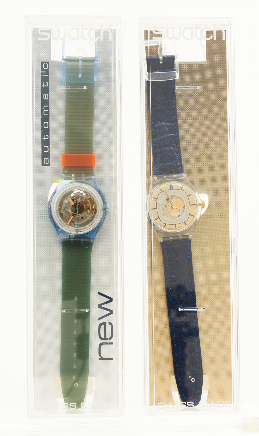 TWO SWATCH AUTOMATIC WRISTWATCHES COMPRISING, BLUE MATIC REF. SAN100, 1991, TO PLASTIC BANDS, BOXED AND HIDDEN VIEW, REF. SAK117, 1995, TO BLUE LEATHER BANDS, BOXED