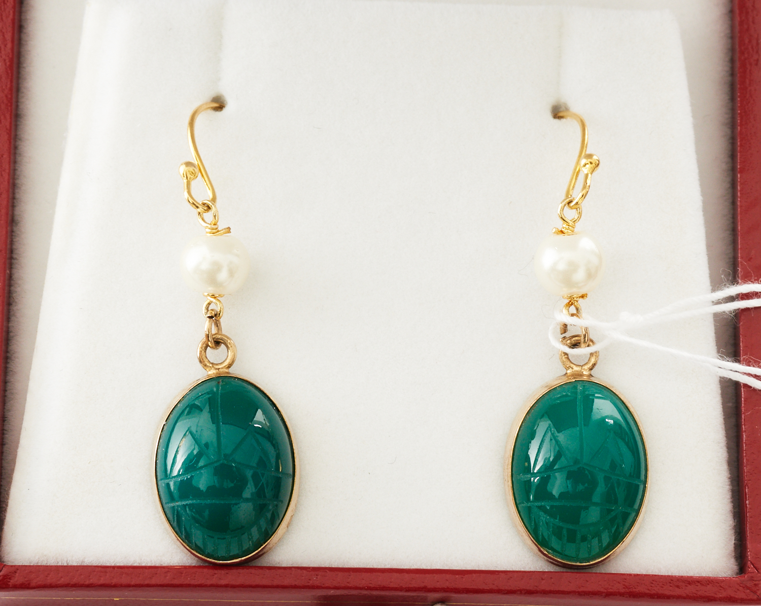 A PAIR OF GREEN AGATE SCARAB AND PEARL DROP EARRINGS, GOLD LINED, LENGTH 37MM, BOXED