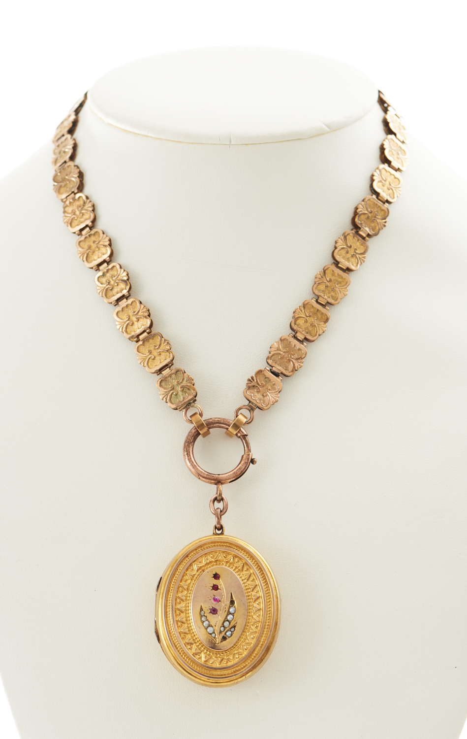 A VICTORIAN GARNET AND SEED PEARL SET LOCKET TO A FANCY LINK CHAIN, GOLD LINED, CHAIN LENGTH 400MM
