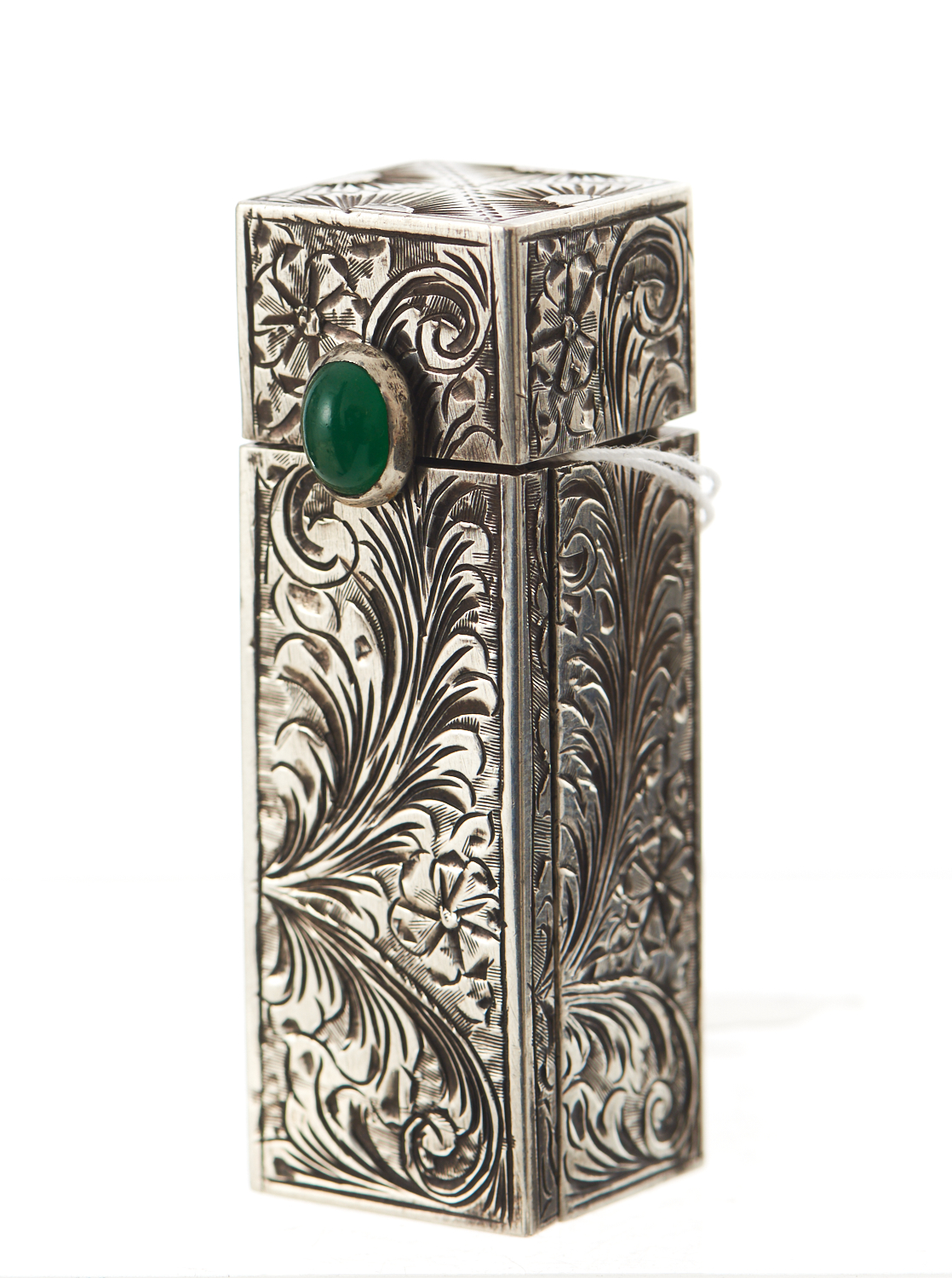 AN ITALIAN LIPSTICK HOLDER WITH GREEN CHALCEDONY BUTTON, IN ENGRAVED STERLING SILVER