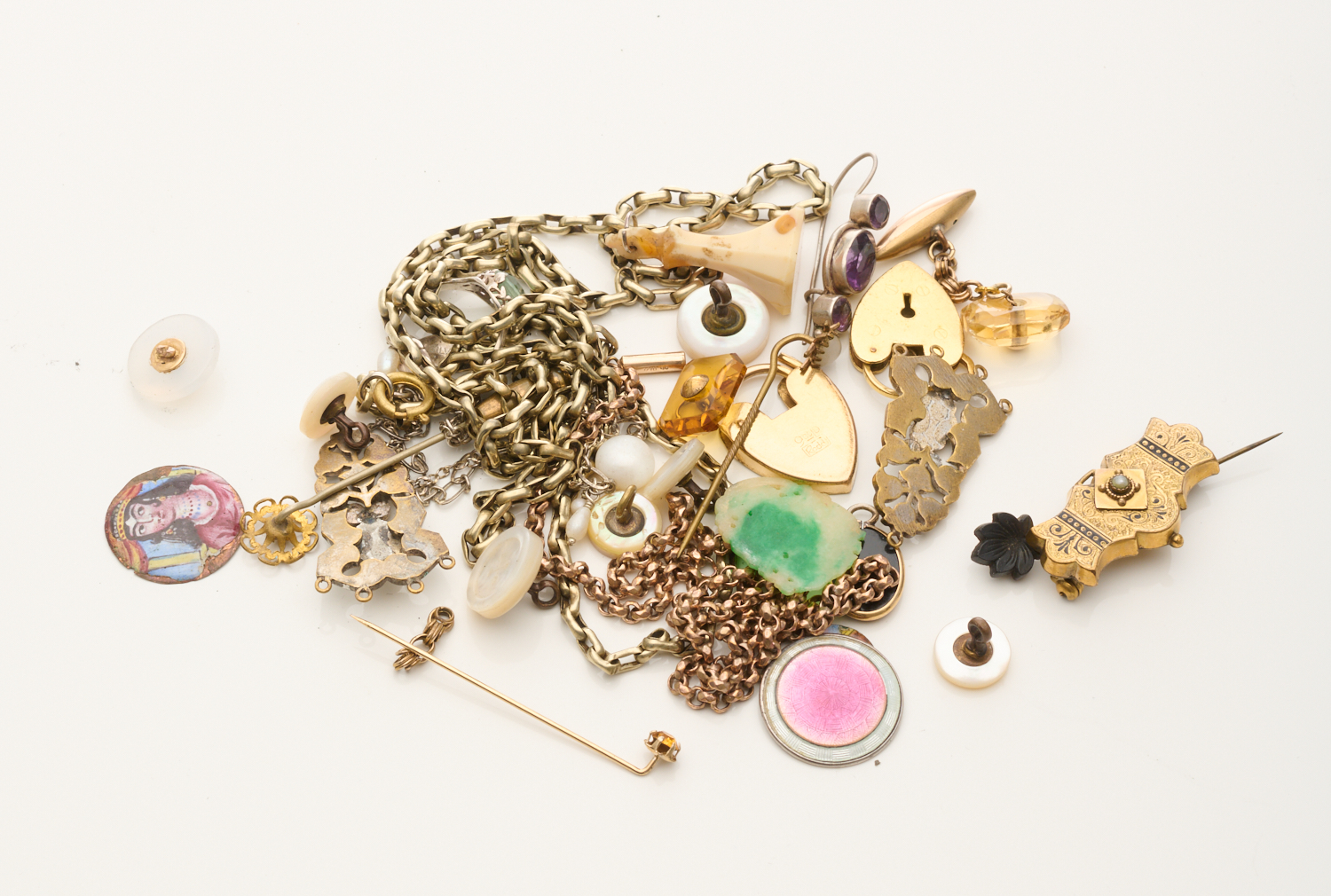 A COLLECTION OF ANTIQUE AND VINTAGE JEWELLERY FINDINGS INCLUDING CHAINS, CUFFLINKS, A BRACELET ETC
