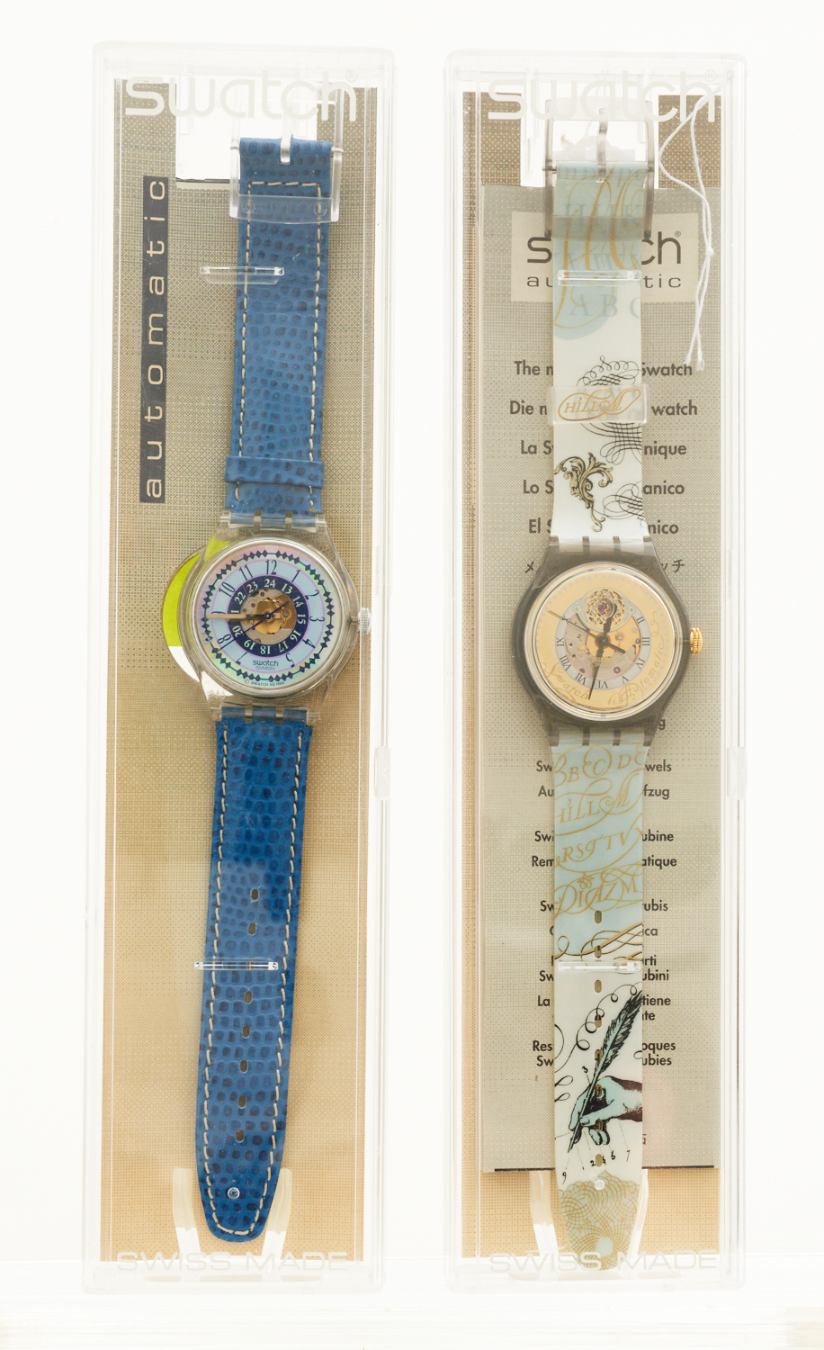 TWO SWATCH AUTOMATIC WRISTWATCHES COMPRISING, PITTI REF. SAM105, 1995, TO PLASTIC BANDS, BOXED AND RUISSEAU, REF. SAK110, 1994, TO BLUE LEATHER BANDS, BOXED