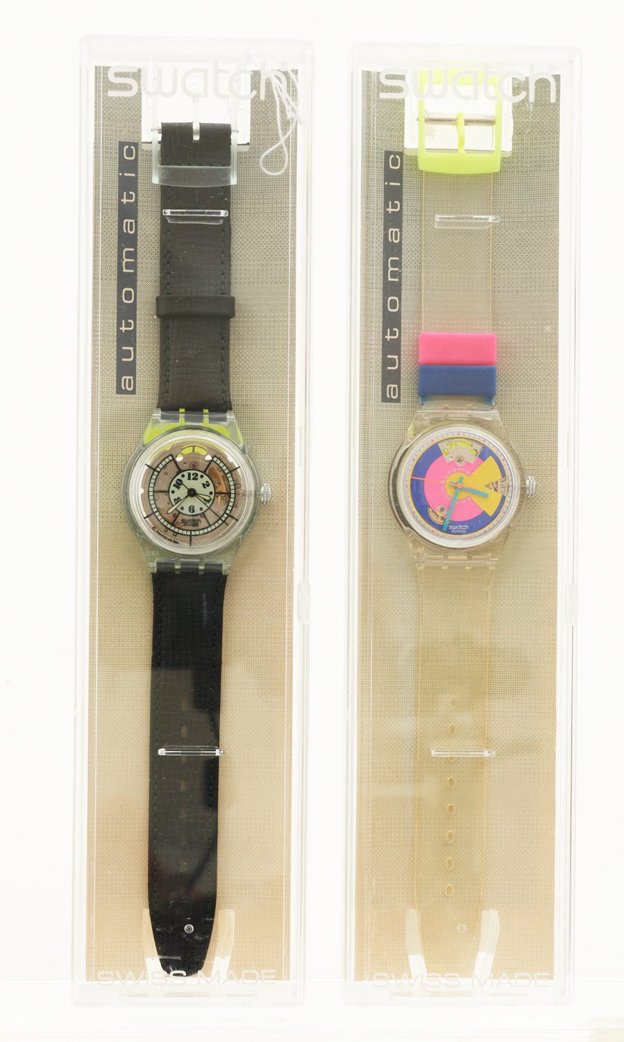 TWO SWATCH AUTOMATIC WRISTWATCHES COMPRISING, GRIN REF. SAG101, 1994, TO BLACK LEATHER BANDS, BOXED AND HAPPY WHEELS, REF. SAK109, 1993, TO PLASTIC BANDS, BOXED